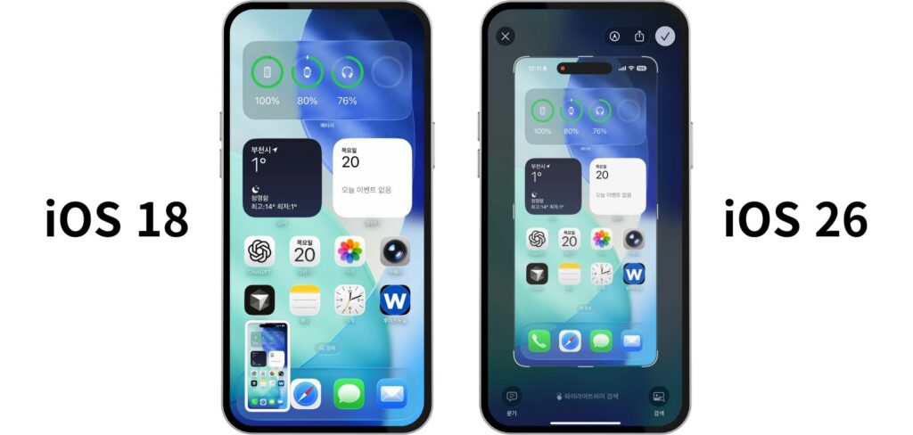 iOS 26은 화면 캡처 후 전체 화면 미리보기(편집 화면)를 먼저 표시하도록 기본 동작이 변경되었습니다.